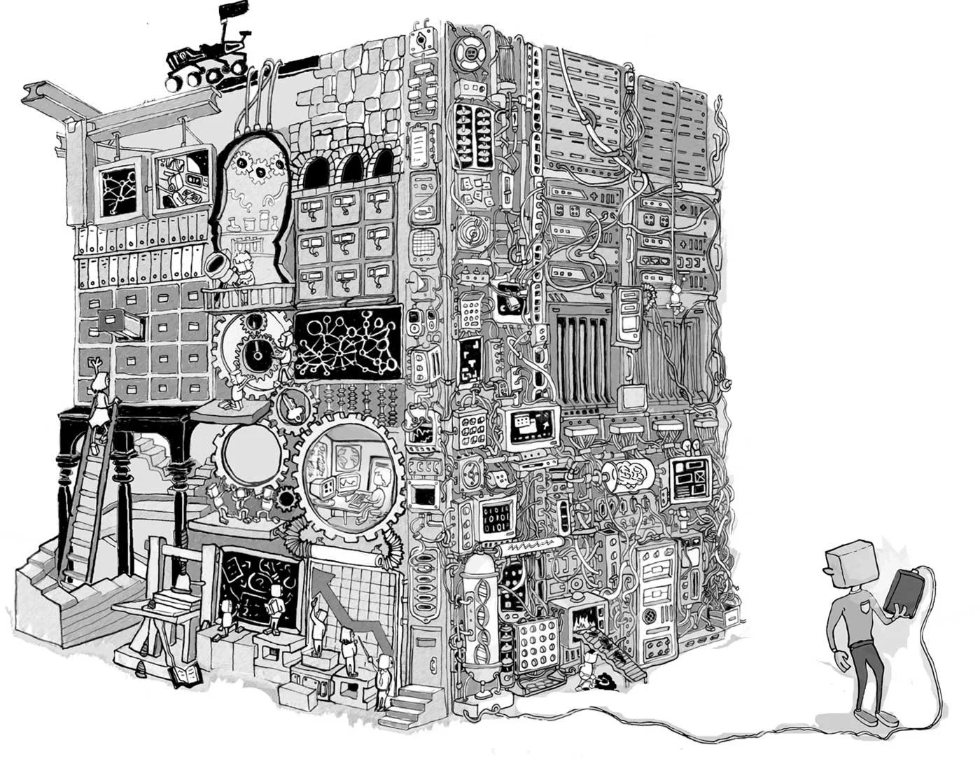 Caption: This image captures the ‘relational’ properties of infrastructure: you can see a figure on the bottom right focused on their work but with their back turned to the infrastructure that makes it possible. Infrastructure always enables and obscures, both at once.